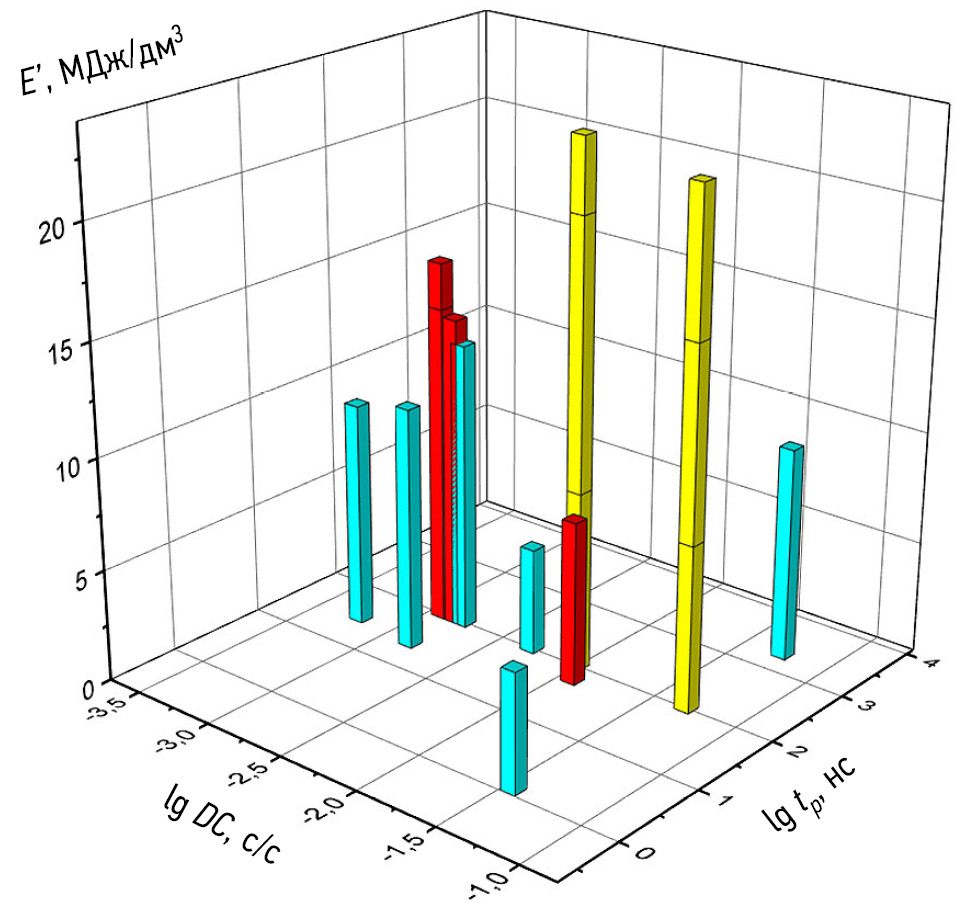 Анализ полученных нами в экспериментальной серии данных (в табл. 2) в сочетании с результатами аналогичных работ в данном направлении (с применением ОКГ с наносекундными импульсами — см. табл. 3 и рис. 5 и 6) показал наличие сложного многопараметрического характера связи между входными режимными параметрами и выходными характеристиками, а также то, что одними из наиболее явно (и прямо пропорционально) влияющих на интенсивность (т. е. обратные энергозатраты) процесса удаления органических слоев (различного состава) входных параметров являются коэффициент заполнения и длительность импульса излучения. Причем для случая небольшой группы режимов в нашей экспериментальной серии по ЛО зависимость для удельных энергозатрат (как показано на рис. 7) в однофакторном приближении может быть аппроксимирована в виде: ~ (const + (1 / lg (DC ∙ tp))), т.е. как обратно пропорциональная зависимость (параболического типа) параметра E’ от логарифма произведения DC ∙ tp = f ∙ tp2. При этом в оптимальных режимах по нашим данным эти энергозатраты на ЛО находятся на уровне 12,7 МДж на 1 дм3 вещества слоя (для случая режимов с удалением эластомерсодержащих загрязняющих веществ с поверхности из стали 40Х).