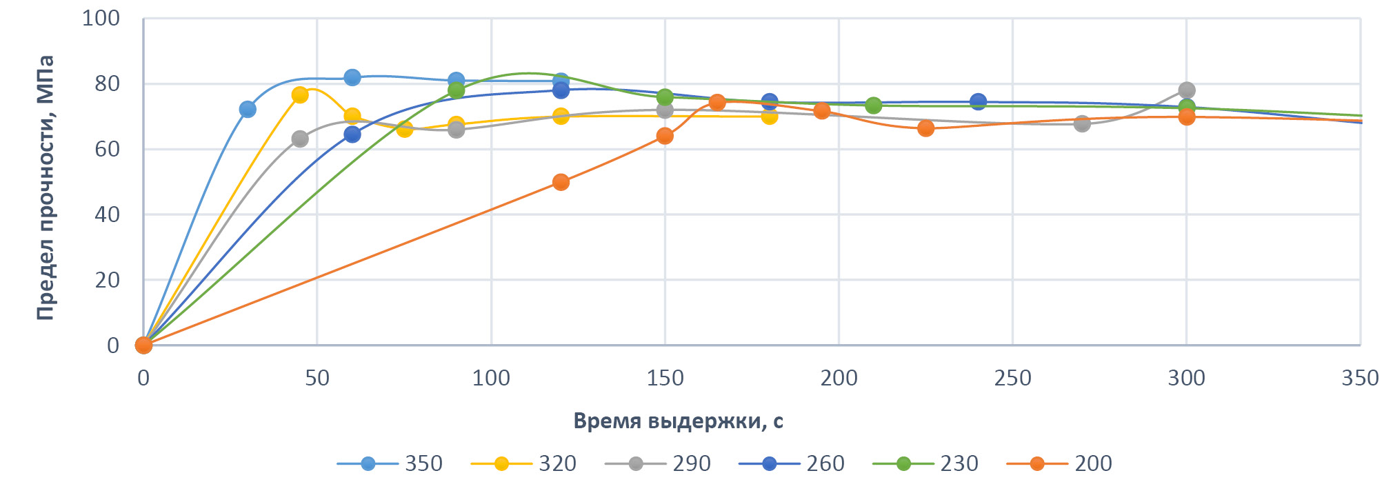 Численные значения роста и падения прочности, полученные в результате опытов, сделали возможным построение графиков зависимости прочности полимера при различных температурах оплавления порошка ПА 6/66-3 в зависимости от времени выдержки в печи представлены на рис. 2.