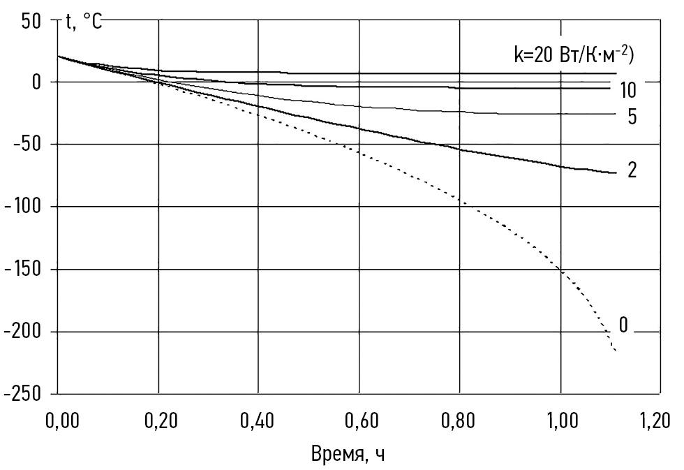 Видно, что весь запас водорода будет израсходован за время, несколько превышающее 1 час. При этом температура водорода будет превышать 0 °С только при достаточно интенсивном тепловом взаимодействии с окружающей средой (k = 20 Вт/(К ∙ м2)), что может оказаться труднореализуемым затесненном отсеке для баллона. Если же баллон будет покрыт оболочкой из малотеплопроводного материала, температура в нем может опуститься до неприемлемо низких значений. Пунктирная линия соответствует предельному случаю идеальной тепловой изоляции блока хранения.