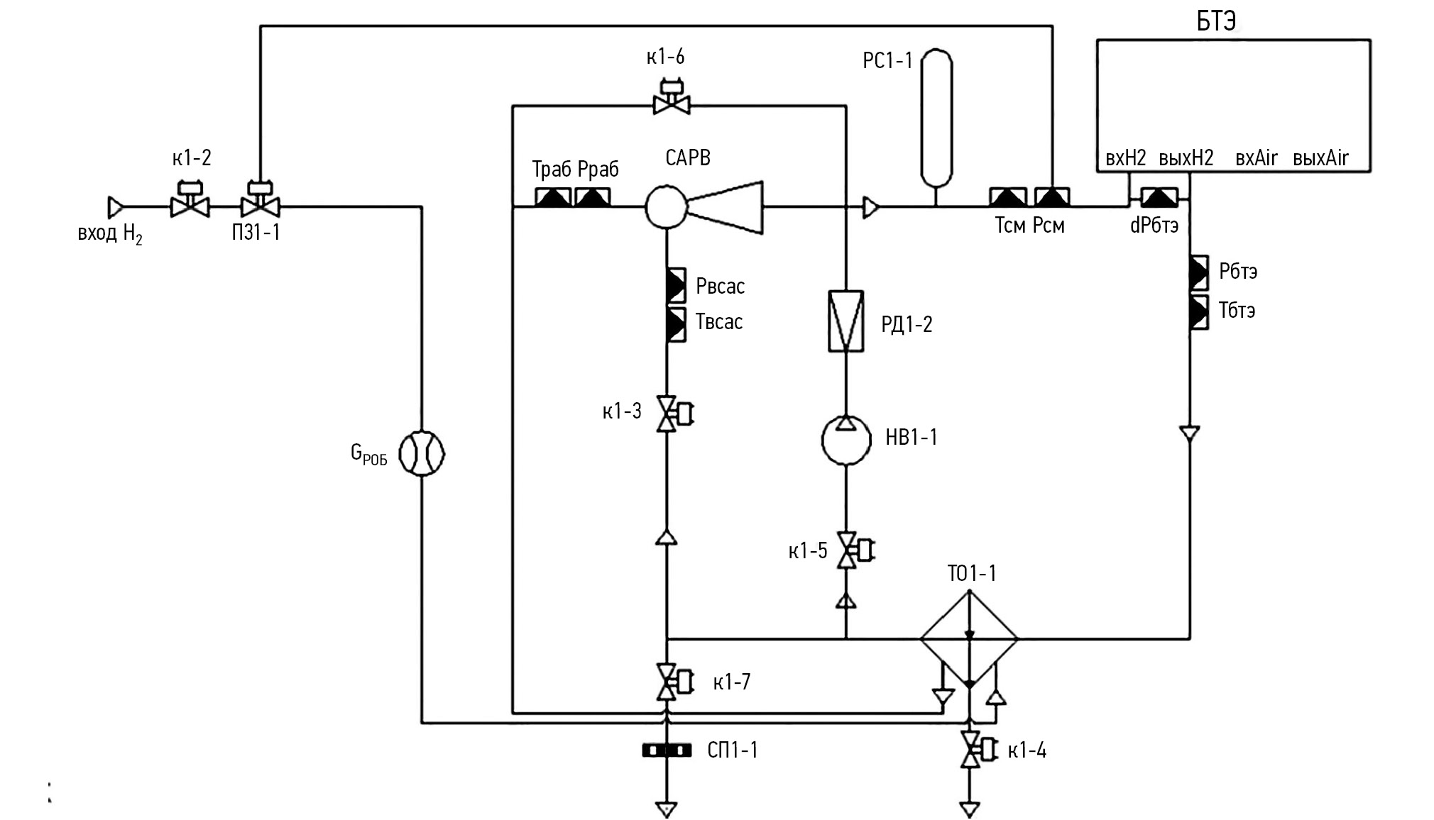 На рис. 3 регулятор, предназначенный для поддержания давления водорода перед входом в БТЭ, обозначен как ПЭ-1. Для установления необходимого давления при изменяемом расходе газа он использует обратную связь от датчика давления Pсм на входе в напорный тракт батареи. Холодный водород поступает от системы хранения в теплообменный аппарат ТО1-1, где подогревается от теплого неиспользованного в процессе реакции водорода, извлекаемого из камер БТЭ за счет струйного аппарата рециркуляции водорода (САРВ) и поступает в напорную топливную магистраль электрохимического генератора. Совокупность САРВ, ТО1-1, микропроцессорной системы управления циркуляцией газов, датчиков и трубопроводов называется системой рециркуляции водорода (СРВ).