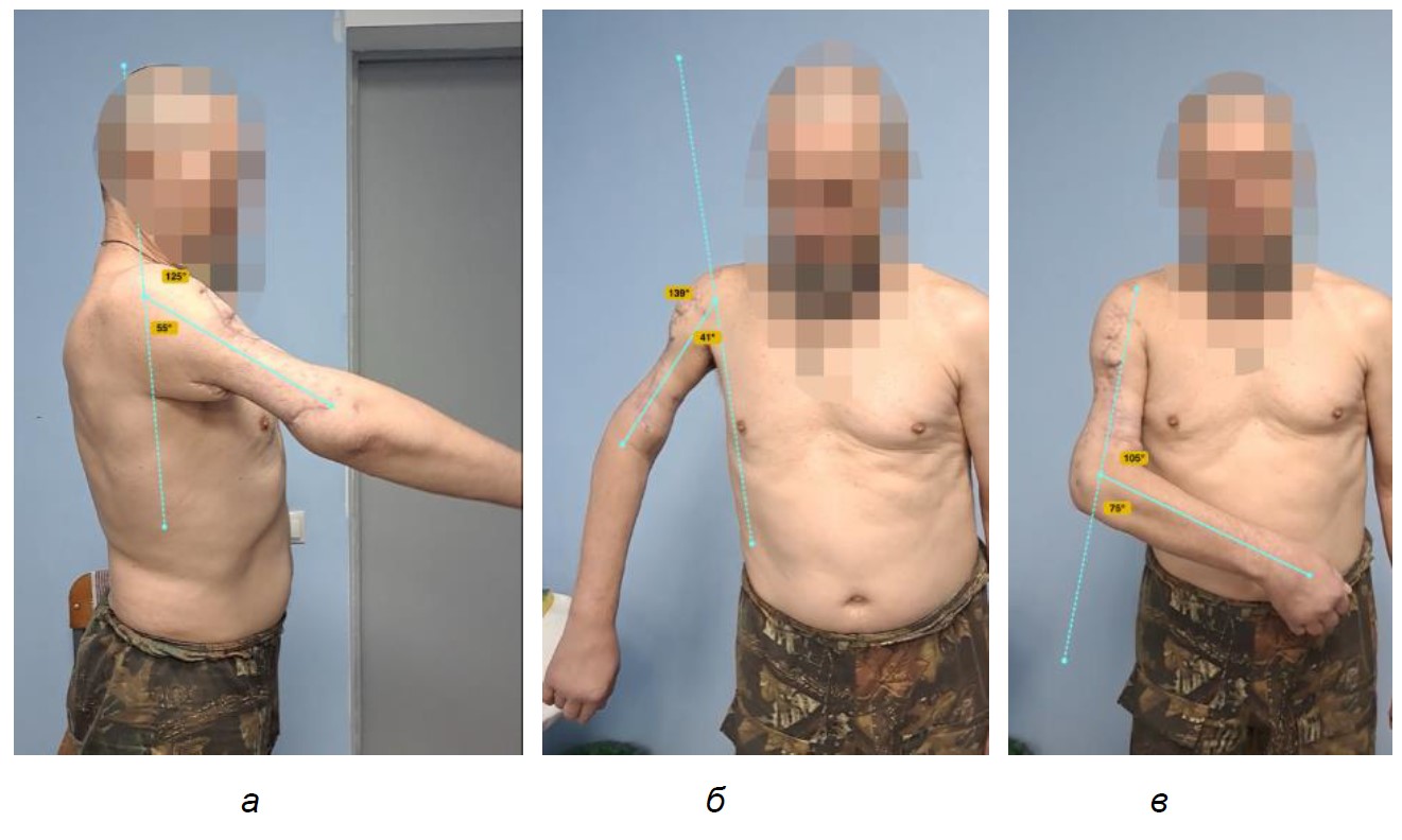 Пациент обратился для проведения реабилитации с помощью экзоскелета «Экзар34». На момент обращения мышечная сила снижена в правой верхней конечности, причем в проксимальных отделах значительнее чем в дистальных. Активное сгибание в плечевом суставе до 55° (рис. 3а). Активное отведение правого плеча в пределах 40 градуса (рис. 3б). Объем движений в правом локтевом суставе – 105–160° (рис. 3б, в). Мышечная сила значительно снижена. Отсутствие активного разгибания кисти и пальцев. Правая кисть «обезьянья». Пассивное отведение и сгибание правой верхней конечности в плечевом суставе, превышающие активные движения, затруднены за счет контрактуры.