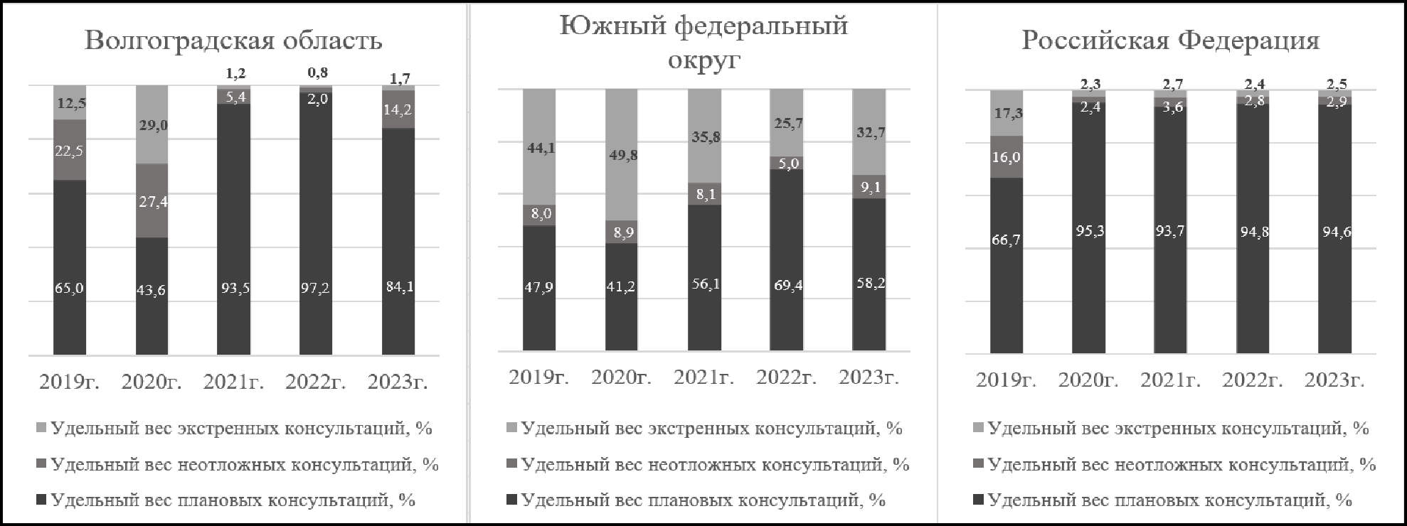 Рис. Удельный вес плановых, неотложных и экстренных ТМК в Волгоградской области, Южном федеральном округе и в Российской Федерации в 2019–2023 гг.