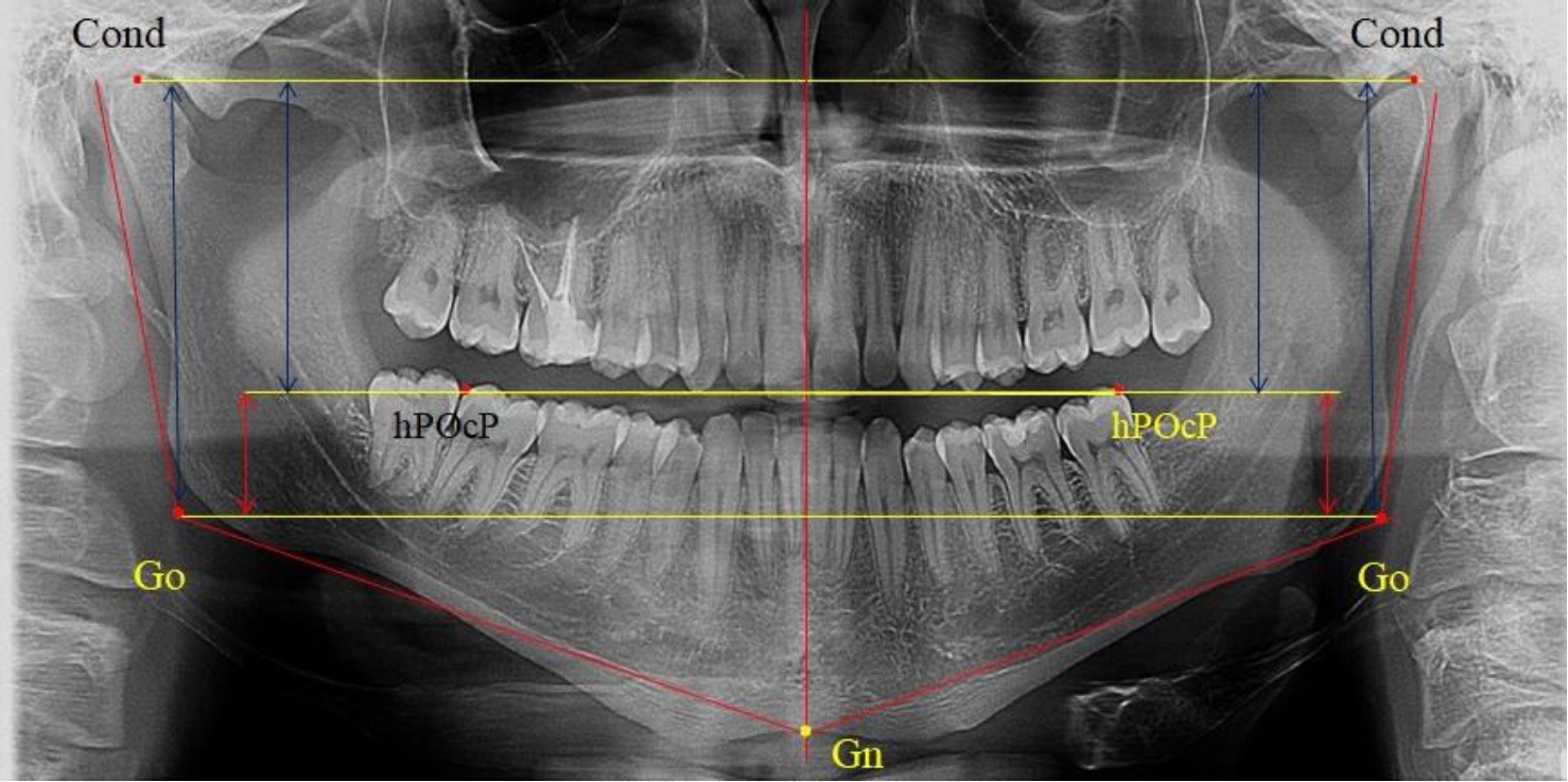 На ортопантомограмме использовали аналогичные суставные точки Cond на каждой стороне, их соединяли между собой суставной линией Cond-Cond.