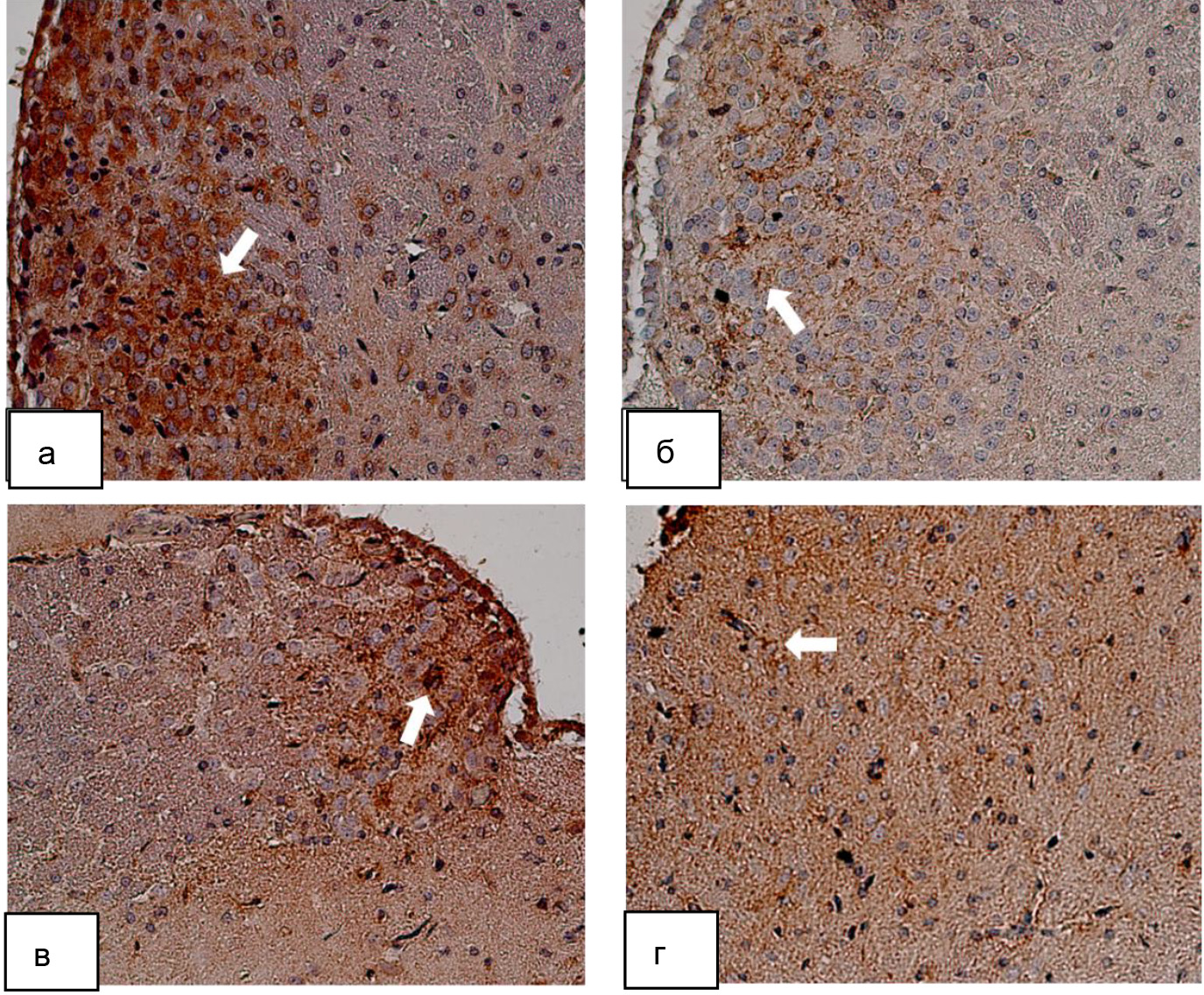 Рис. 1. Изменение экспрессии белка Klotho в цитоплазме нейронов гипокампа крыс при экспериментальном сахарном диабете: а – группа интактных животных (крысы без СД); б – группа животных с сахарным диабетом (СД); в – группа животных с сахарным диабетом и фармакокоррекцией аминалоном (СД + аминалон); г – группа животных с сахарным диабетом и фармакокоррекцией сукцикардом (СД + сукцикард). Иммуногистохимическое исследование, антитела против белка Klotho, докраска гематоксилином. Увеличение ×400. Белые стрелки – экспрессия ИРМ