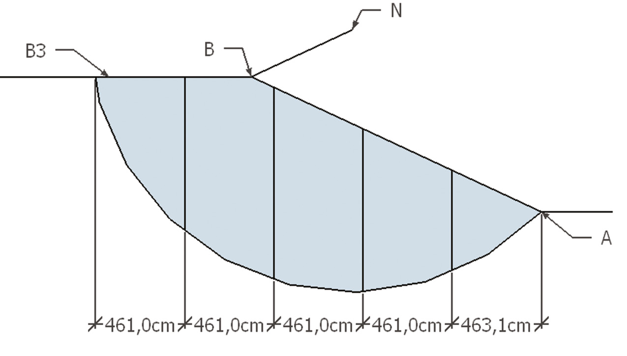 Для применения полученных результатов на практике было принято решение рассчитать на устойчивость условный склон. Наиболее полным и удобным для ручного расчета является упрощенный метод Бишопа [2]. Была задана математическая модель склона, находящегося в предельном состоянии, высота и длина которого 700 см и 1500 см соответственно.