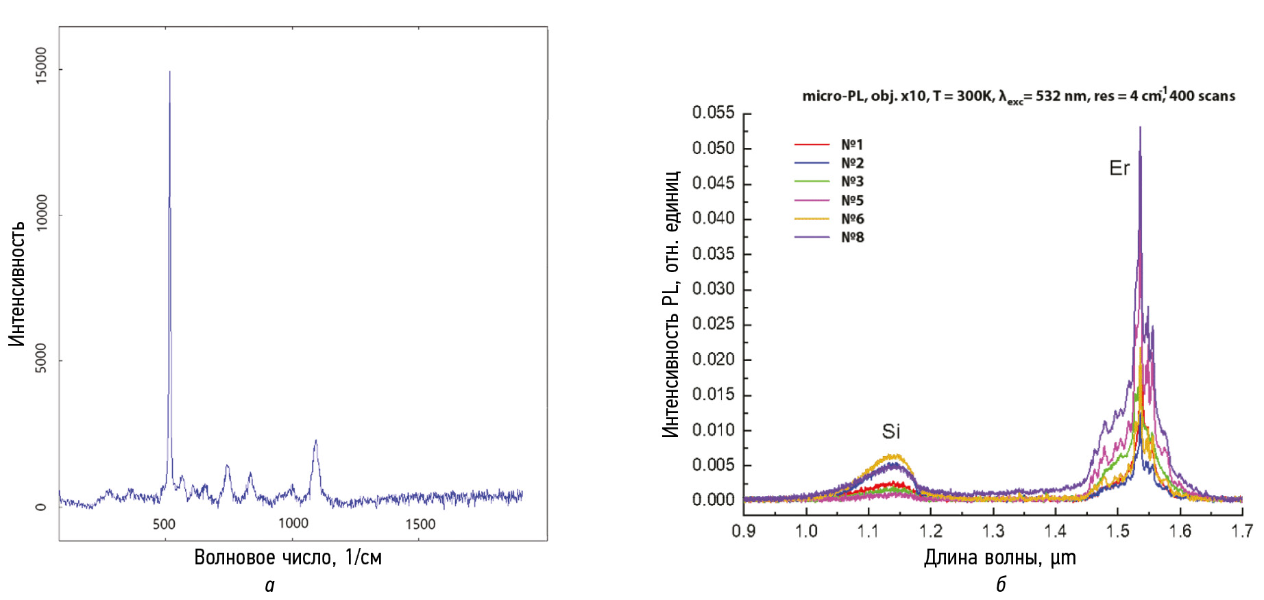 Полученные структуры показывают хорошие люминесцентные свойства при комнатной температуре, не проявляя обычного в таких случаях концентрационного гашения люминесценции [3]. Спектры микро-ФЛ (рис. 1, б) всех исследованных образцов демонстрировали пики в диапазоне длин волн от 1,46 до 1,58 мкм, соответствующие переходам между мультиплетами эрбия 4I13/2 и 4I15/2. Также были зафиксированы менее интенсивные пики на длине волны 1,14 мкм, связанные с излучением кремния.