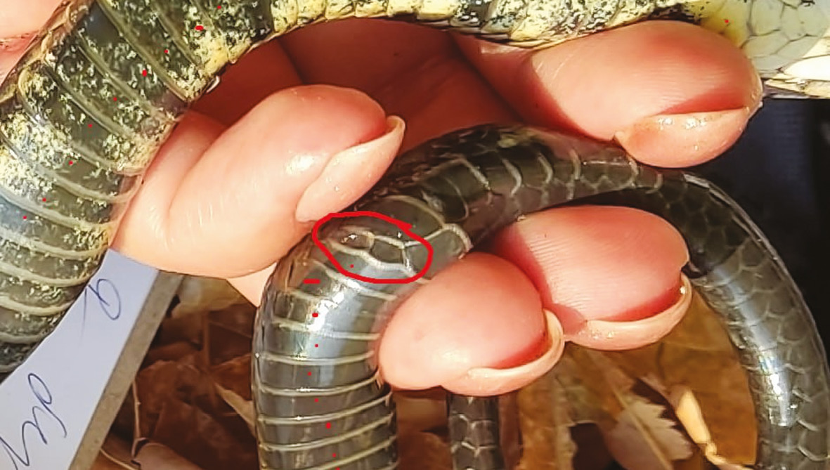 Фолидоз водяных ужей в исследуемой популяции: из 44 отловленных 1 особь имела асимметрию губных щитков, а у 7 наблюдалась асимметрия височных щитков второго ряда. Помимо этого, было обнаружено 3 змеи с аберрациями фолидоза брюха (рис. 1).