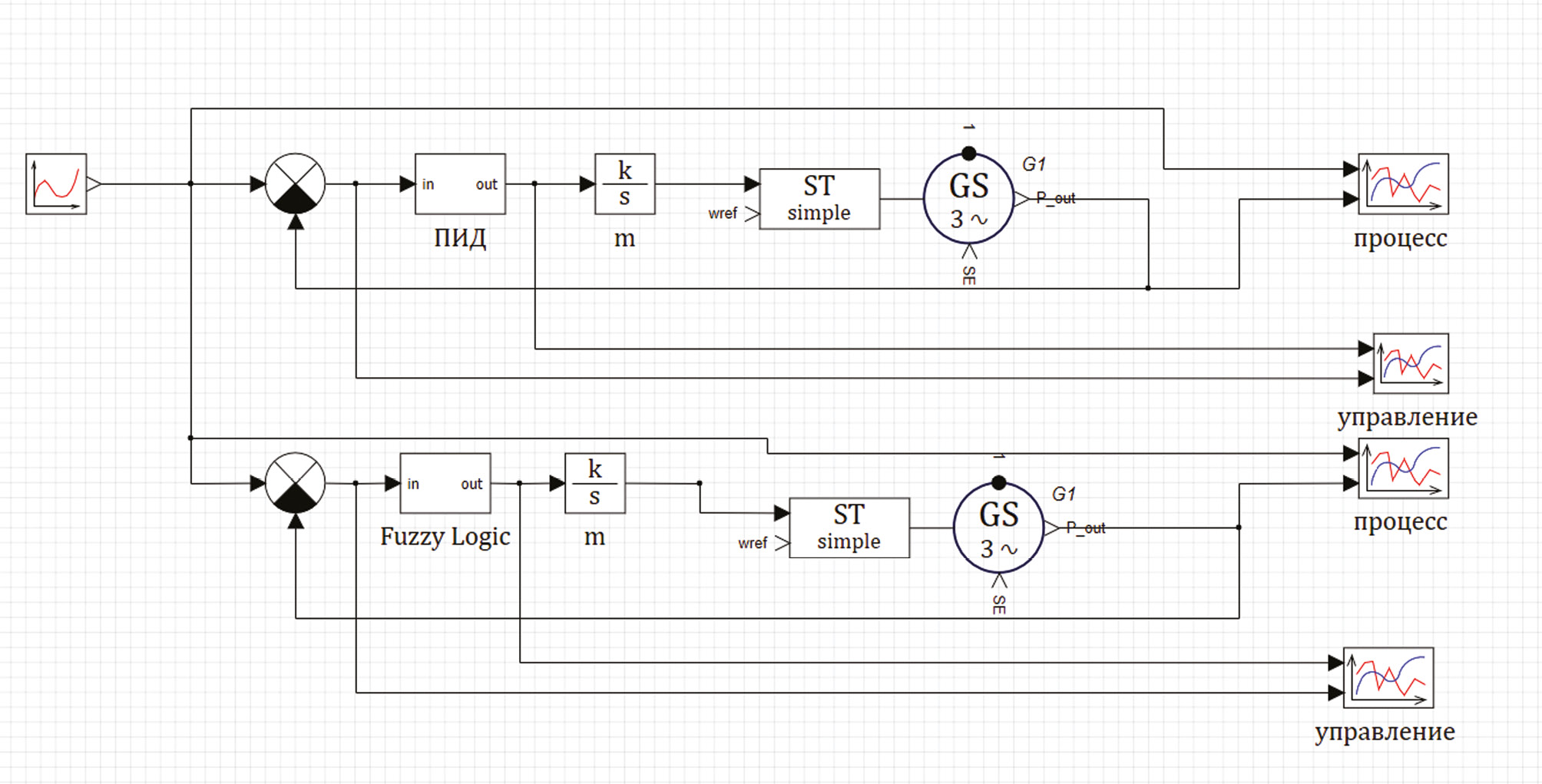 Для управления ДГУ был применен ПИД-регулятор на основе нечеткой логики. Отладка модели регулятора с генерацией управляющего кода выполнялась в среде динамического моделирования SimInTech. Модель регулятора приведена на рис. 2.