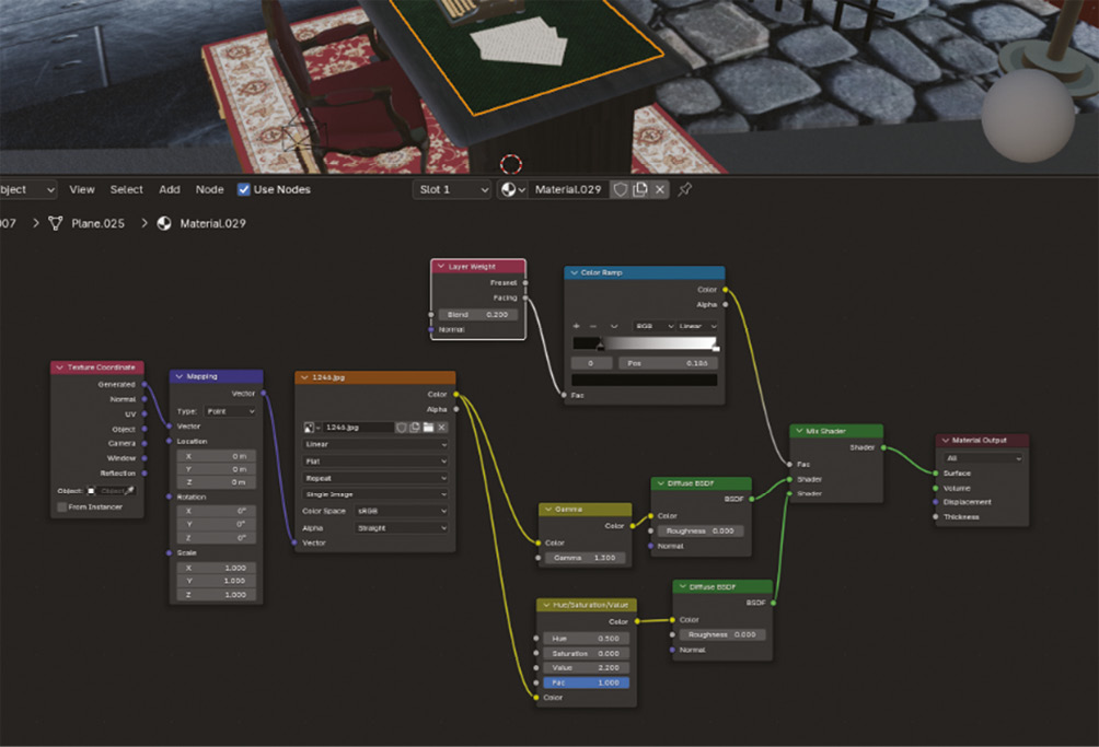 Каждый из методов, представленных выше, использовался комплексно или по отдельности для создания разного рода объектов. После чего происходил метод текстурирования, в процессе которого каждому элементу назначался цвет, который на самом деле не является цветом поверхности, а обозначает цвет каркасной структуры. Метод текстурирования включает в себя ряд процессов, от наложения определенного цвета до определения прозрачности или зеркальности. И завершающим этапом стало наложение редакторов материалов, что позволило передать реалистичную текстуру дерева, металла, камня и т. д.