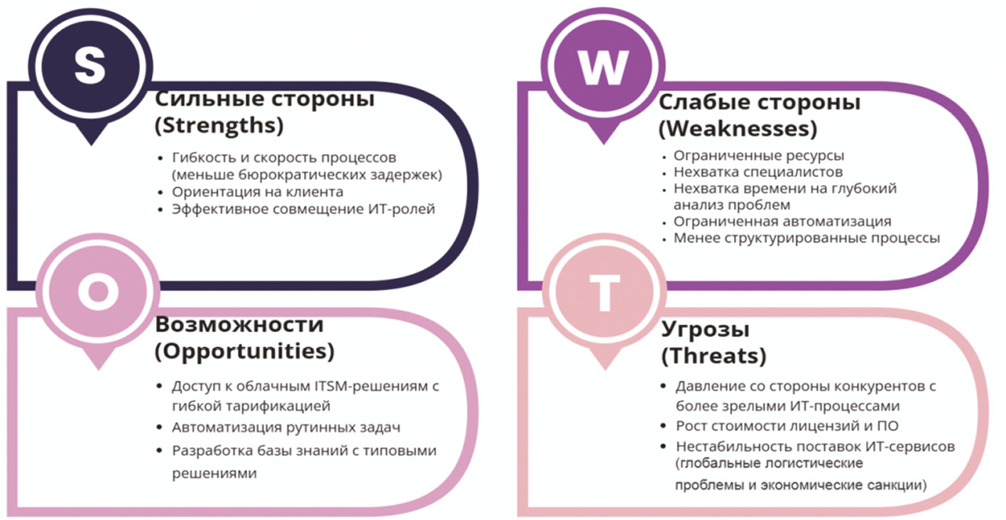 Методы. Для получения результатов исследования были использованы методы: анализ документации и лучших практик ITIL, общеотраслевых тенденций МСБ; SWOT-анализ; BPMN-моделирование.