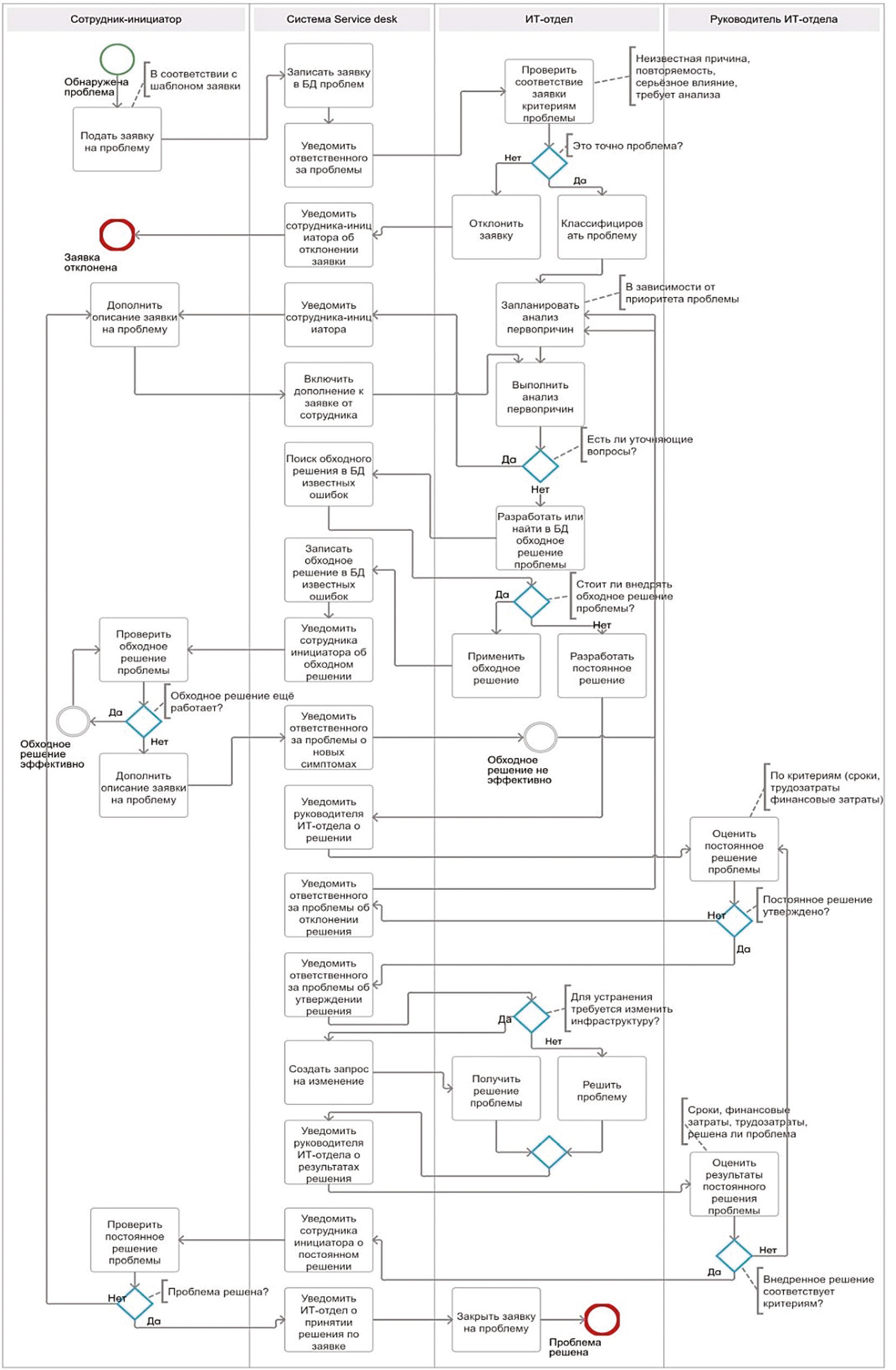 На диаграмме представлена адаптированная модель процесса управления проблемами с ролями сотрудника-инициатора, системы Service Desk, ИТ-отдела и руководителя ИТ-отдела. Данная модель содержит классические для ITIL этапы управления проблемами. Однако само исполнение имеет отличие. При обнаружении и регистрации проблемы делается акцент на быструю и простую подачу заявки. Упрощен процесс классификации, первыми рассматриваются проблемы с наибольшим влиянием на бизнес. При исследовании проблемы используются несложные и оперативные методы (например, «5 почему») и обходные решения, не требующие высоких затрат и быстро восстанавливающие работу сервиса. Постоянные решения, которые часто требуют изменений в ИТ-инфраструктуре, согласуются с руководителем отдела. При решении проблемы заявка закрывается, решения документируются.