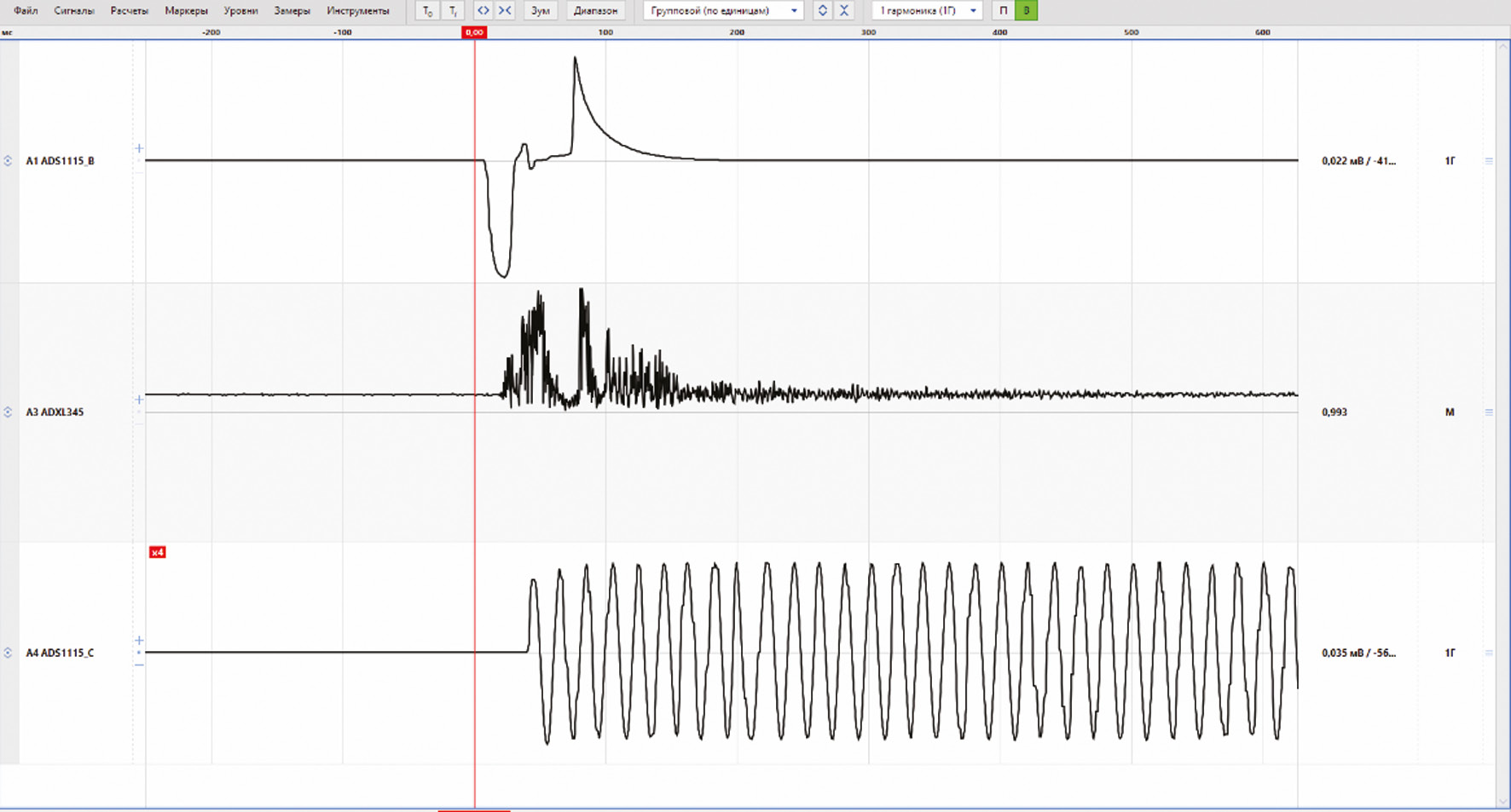 Рис. 3. Осциллограмма, записанная устройством при испытаниях. Показаны ток в цепи управления, вибрационный отклик и ток в силовой цепи