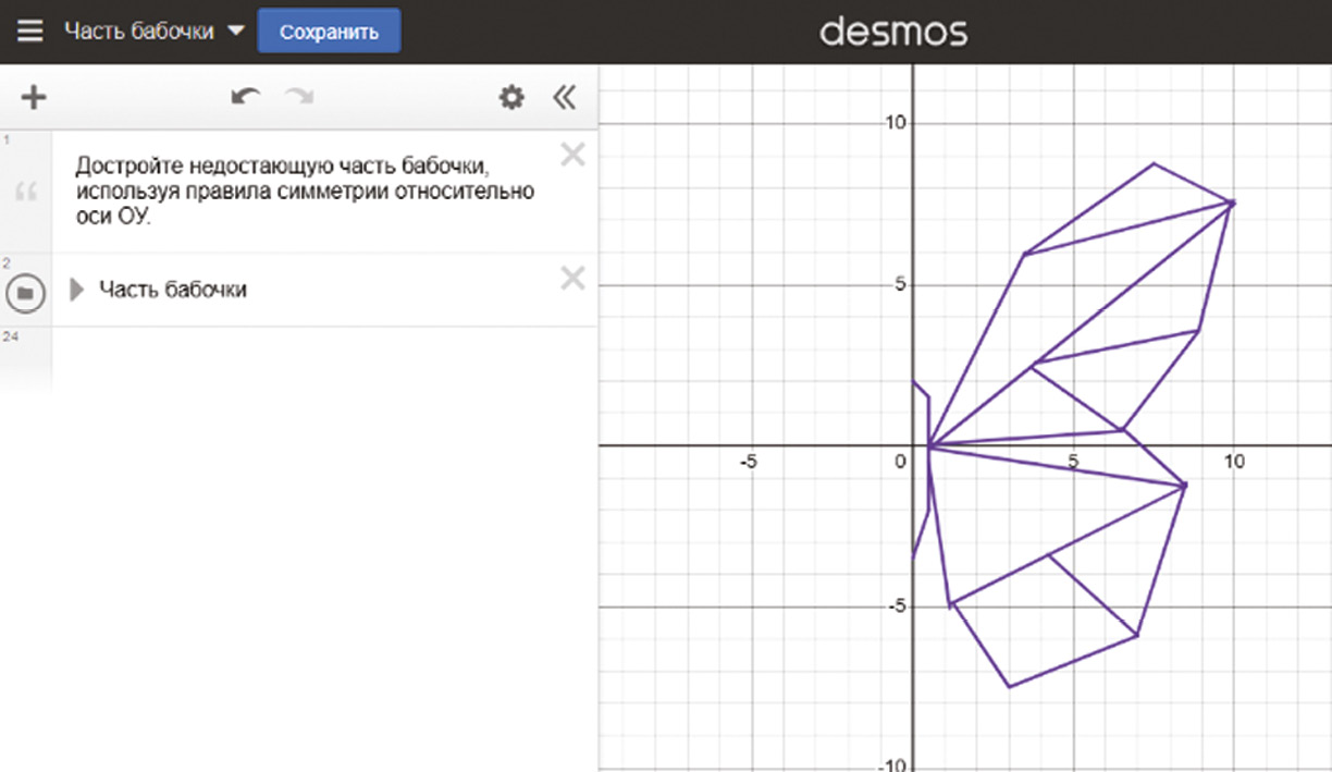 1. «Осевая и центральная симметрии». Задания основаны на том, что дан фрагмент изображения, выполненный в интерактивной среде Desmos (рис. 1). Обучающимся необходимо достроить рисунок до целого, применяя понятие осевой симметрии. Данная тема рассматривается в рамках нескольких разделов математики, на разных ступенях (5–6-е, 7–9-е классы), с возрастанием строгости изучения понятия (от описательного до формального определения). Также при разработке подобных задач возможно обучающимся предложить добавить параметр в координаты точек или аналитическую запись функции, что позволит сделать изображение динамичным. Такой подход обеспечит пропедевтику понятия параметр.