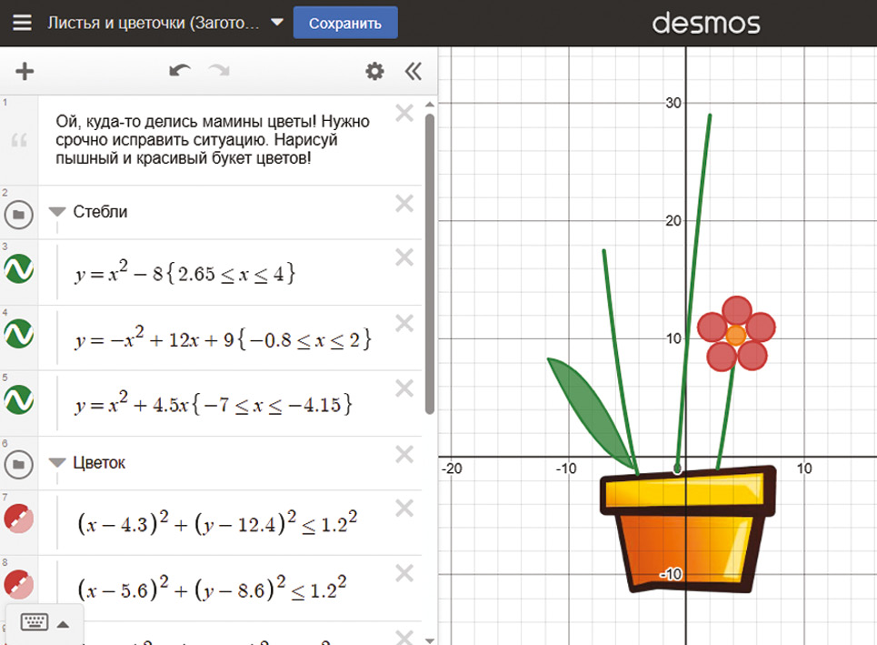 2. «Числовые неравенства» и «Функционально-графический метод решения неравенств». Первый тип заданий данного раздела подразумевает под собой демонстрацию изображения или части изображения, выполненного с помощью линейных или квадратичных неравенств (рис. 2). Обучающимся предлагается сделать такой же рисунок самостоятельно и достроить данное изображение: добавить «цветочки» и «листочки», используя кусочные функции.