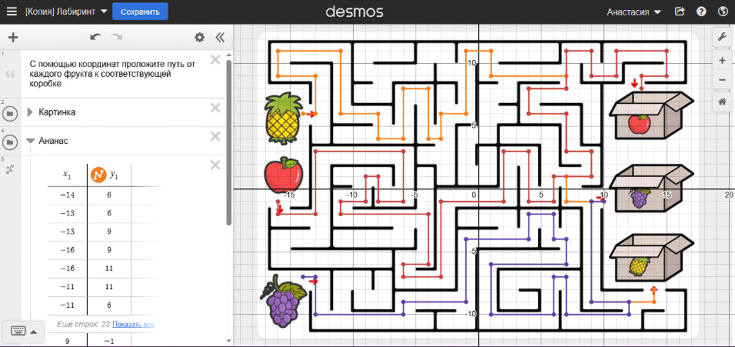 3. «Координатная плоскость. Координаты точек». Первый тип заданий основан на построении различных фигур и объектов, примеры которых предложит учитель. Сложность данных заданий определяется тем, из какого количества координат состоит фигура, какое количество объектов в целом необходимо разместить на координатной плоскости и необходимо ли введение параметра. И второй тип задач раздела «Координатная плоскость» основан на том, чтобы определять координаты точек и строить ломаные на координатной плоскости. На рис. 3 представлено задание «Лабиринт».