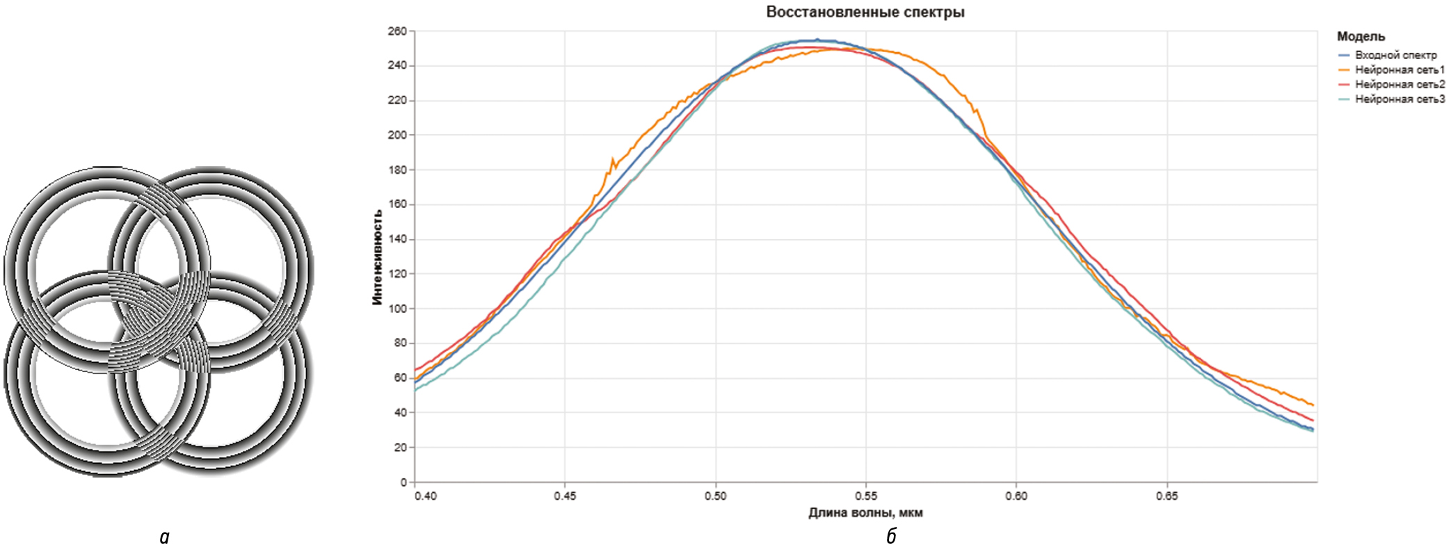 Рис. 1. Схематичный вид фазовой функции матричного гиперспектрометра 2×2 (а), восстановленные нейронными сетями и исходный спектры (б)
