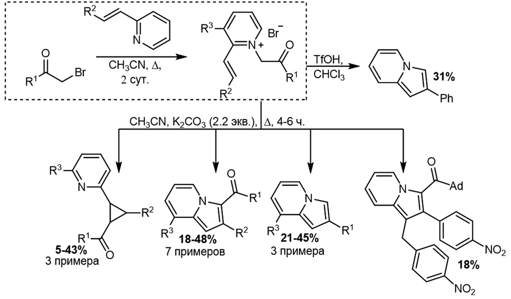 Цель — разработка методов синтеза циклопропанов, моно-, ди- и тризамещенных индолизинов в основных средах на основе солей пиридиния.