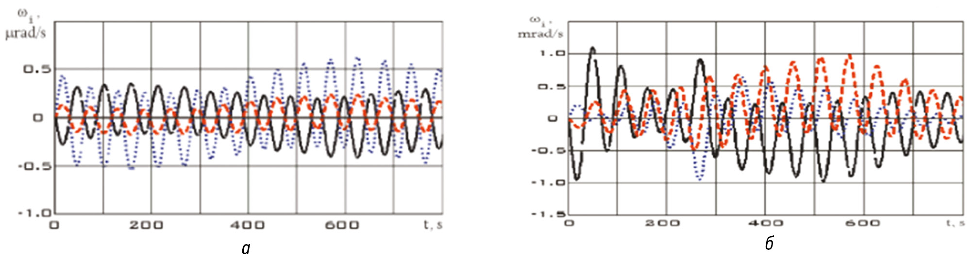 На графиках изменения компонентов вектора угловой скорости в режиме переориентации (рис. 1, б) мы можем проследить заметные резкие отклонения на отрезке [–0,9; 1,1], это может быть связано с моментом, который придали аппарату. В режиме стабализации сильные скачки наблюдаются по оси ОY [–0,5; 0,6].